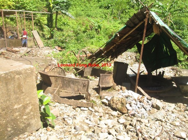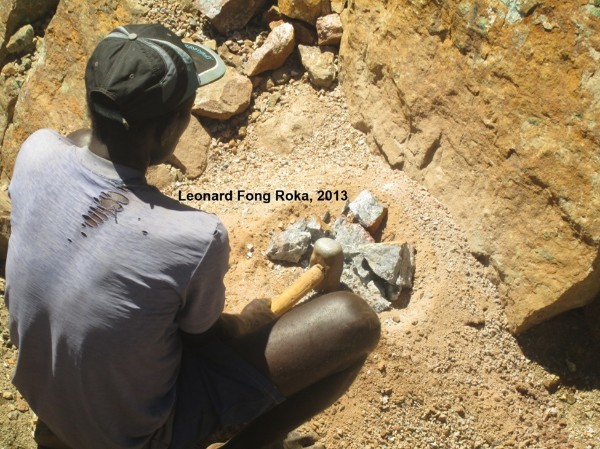 In Kupe the miners now dig out gold bearing rock lumps from a cliff face and move them into safe pockets on the cliff and crush them with sledgehammers to powder. They are filled into bags and shouldered to the foot of the cliff to be processed by women.