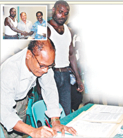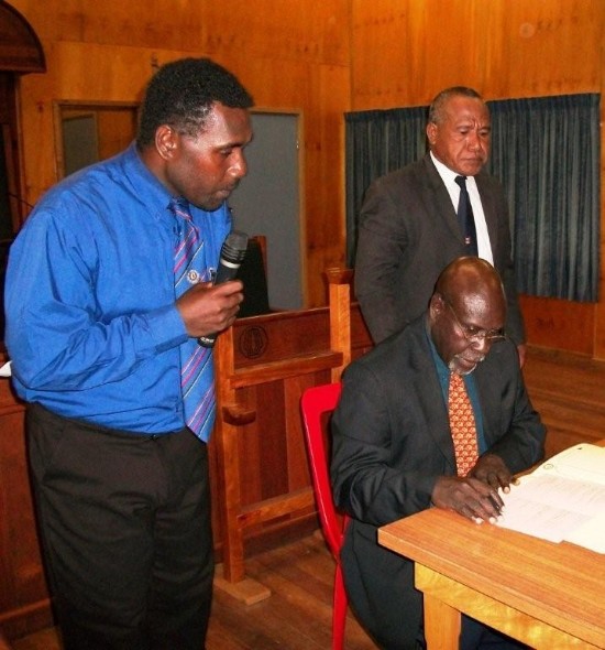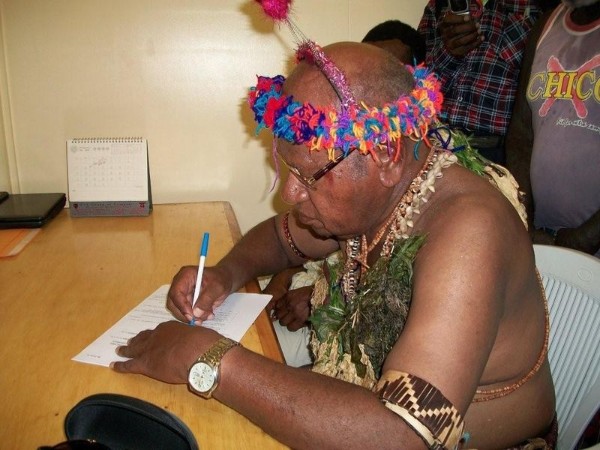 Wearing traditional clothing and a precious golden Swiss ROLEX watch : 69 years old former catholic priest, Bougainville Regional member and PNG Ambassador to China John Momis signing his nomination for presidency.