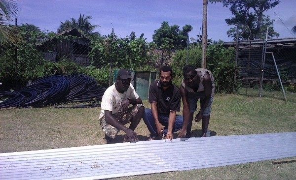 Pictured is Robin Wesly from World vision(centre) with Moses Tupah and Philiph Kobua cutting roofing iron for water catchment to provde clean rain water. World vision will distribute tanks to the afffted community.