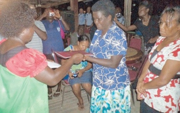 BWF President Hona Holan presenting the BWF Constitution to Mrs Rose Pihei at the Kuri Village Resort