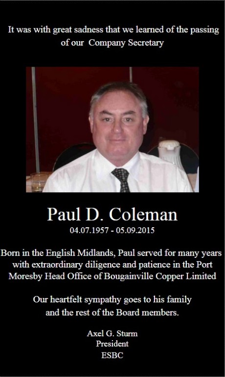Just a fortnight ago, although very ill, Paul, conscious of his long-standing position as PNG manager for Rio Tinto and as company secretary of Bougainville Copper Limited, made a final visit to PNG.